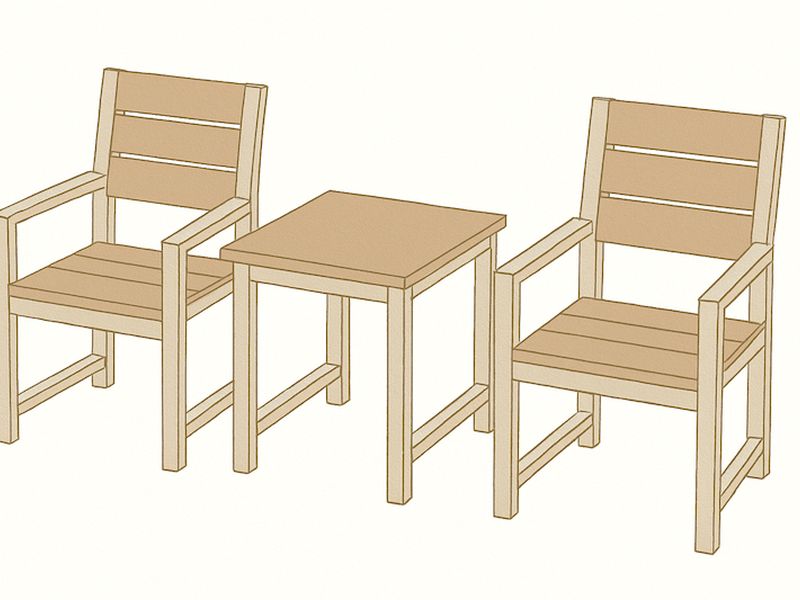 Сиденья стульев изготовлены из прочной доски размером 100×40 мм, спинки — из доски 100×30 мм. Столешница стола выполнена из влагостойкой ламинированной фанеры толщиной 9 мм, устойчива к воздействию влаги и перепадам температур. Все деревянные элементы покрыты атмосферостойким составом, что продлевает срок службы изделия.